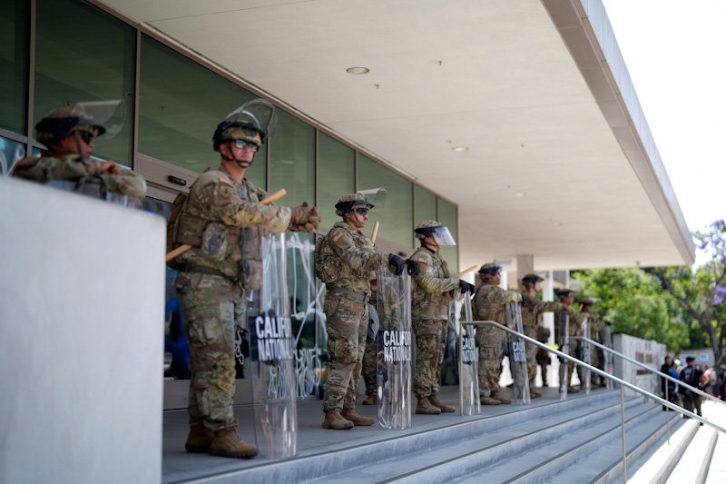 National Guard troops stand guard near the Metropolitan Detention Center on June 9 in downtown Los Angeles. (Photo by Eric Thayer/The Associated Press)